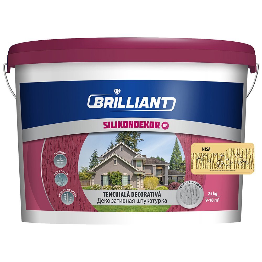 022 268 000Декоративная штукатурка Brilliant Silikondekor RP NISA- декоративная штукатурка, твердая, матовая, структурированная, используется при внутренних и наружных отделочных работах; декоративная штукатурка на основе синтетической смолы, с добавлением силиконизированного латекса и минеральных наполнителей, размер гранул 1,2–1,8 мм; вид массы - однородная паста; наносится на любое минеральное основание: обычные известкого-цементные штукатурки, гипсовые шпатлевки, бетон, гипсокартонные листы и старые окрашенные поверхности стойкие к трению и истиранию.