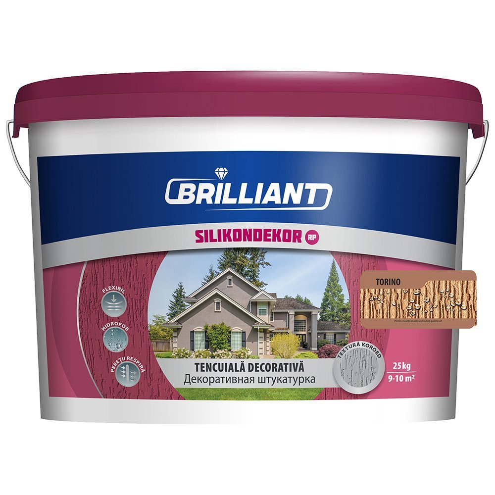 022 268 000Декоративная штукатурка Brilliant Silikondekor RP TORINO- декоративная штукатурка, твердая, матовая, структурированная, используется при внутренних и наружных отделочных работах; декоративная штукатурка на основе синтетической смолы, с добавлением силиконизированного латекса и минеральных наполнителей, размер гранул 1,2–1,8 мм; вид массы - однородная паста; наносится на любое минеральное основание: обычные известкого-цементные штукатурки, гипсовые шпатлевки, бетон, гипсокартонные листы и старые окрашенные поверхности стойкие к трению и истиранию.
