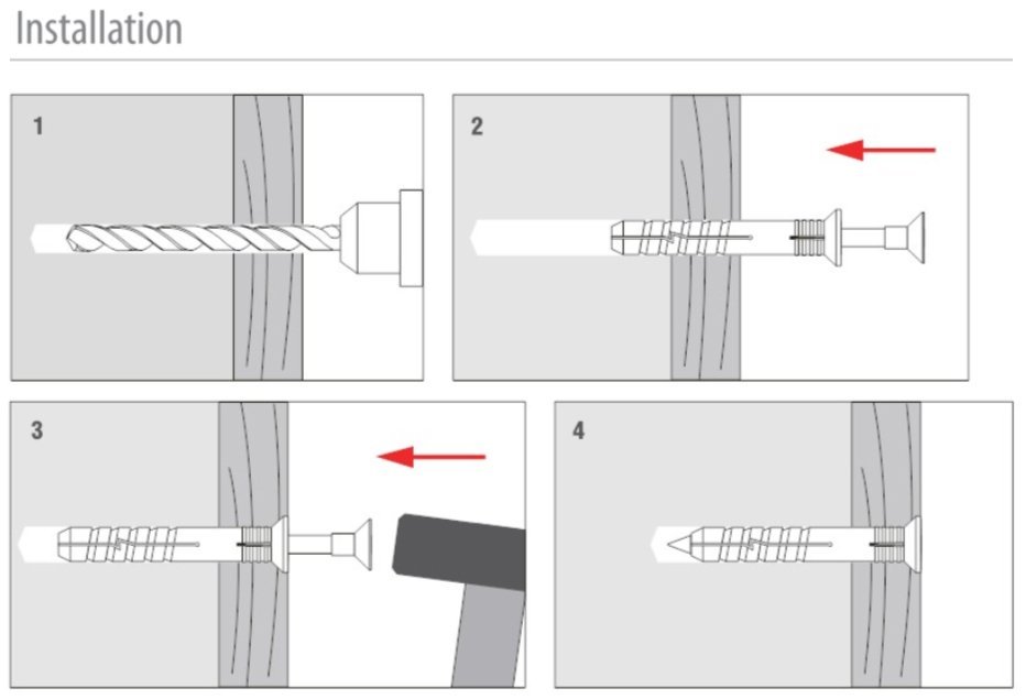 Конструкция дюбеля позволяет добиться простого и быстрого монтажа, а крестообразный шлиц обеспечивает быстрый демонтаж дюбель-гвоздя. Потайной бортик позволяет "утопить" крепеж в закрепляемом материале. Монтаж осуществляется ударом молотка по гвоздю.