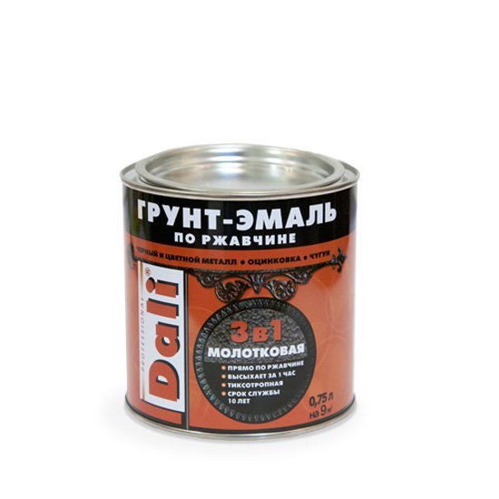 022 268 000Грунт-эмаль по ржавчине 3в1 Dali - алкидная эмаль с молотковым эффектом для защитно-декоративной обработки различных металлических поверхностей, в том числе пораженных точечной или сплошной коррозией. Применяется внутри и снаружи помещений по новым и ранее окрашенным стальным и чугунным поверхностям (решетки, ограды, гаражи, ворота), цветным металлам (цинк, медь, алюминий), поверхностям из оцинкованного металла, нержавеющей стали и деревянным поверхностям. Срок службы покрытия снаружи помещений - до 7 лет, внутри помещений - не менее 10 лет.