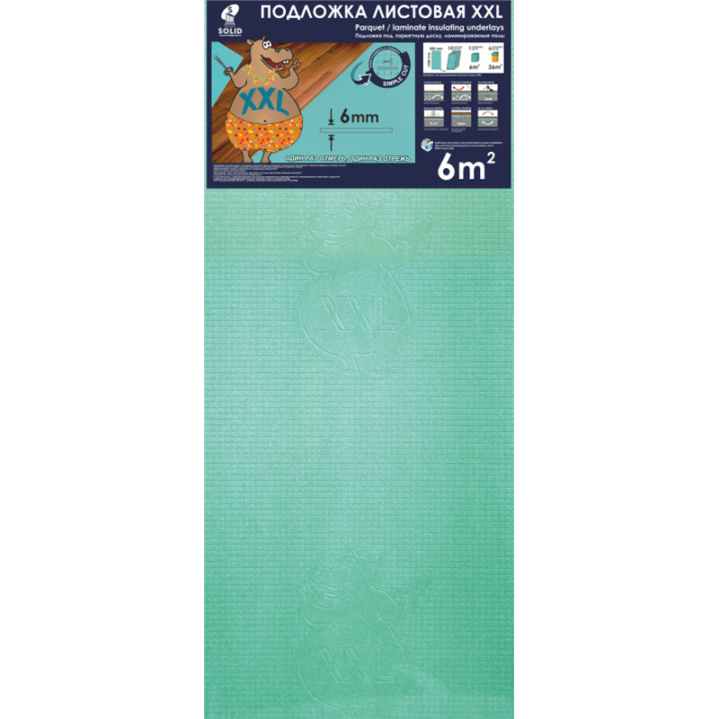 022 268 000Подложка листовая XXL под ламинат и паркетную доску Solid 6мм 0.5x1.2м - при загрузке помещается на 15% больше продукции, чем обычной листовой подложки, тем самым значительно снижаются расходы по логистике; Специальная разметка на подложке позволяет в процессе укладки легко отмерить и отрезать полотно.