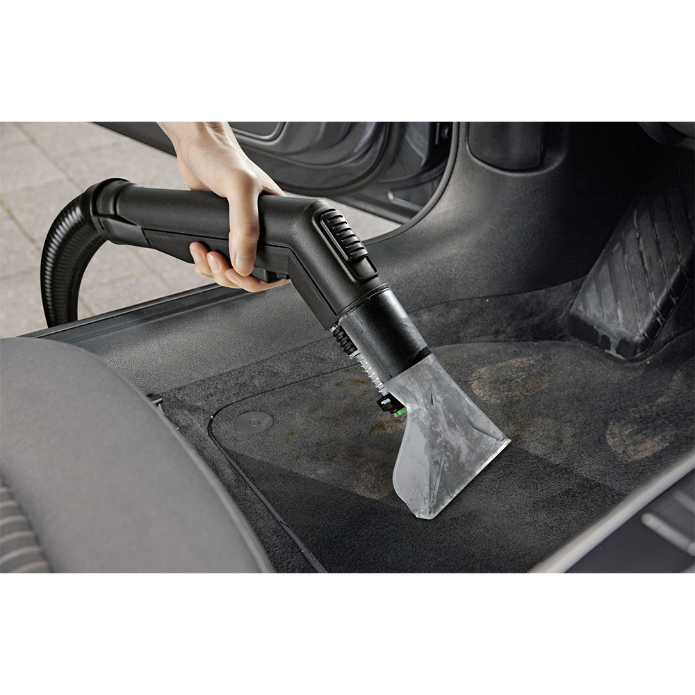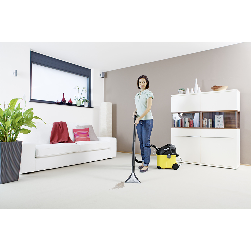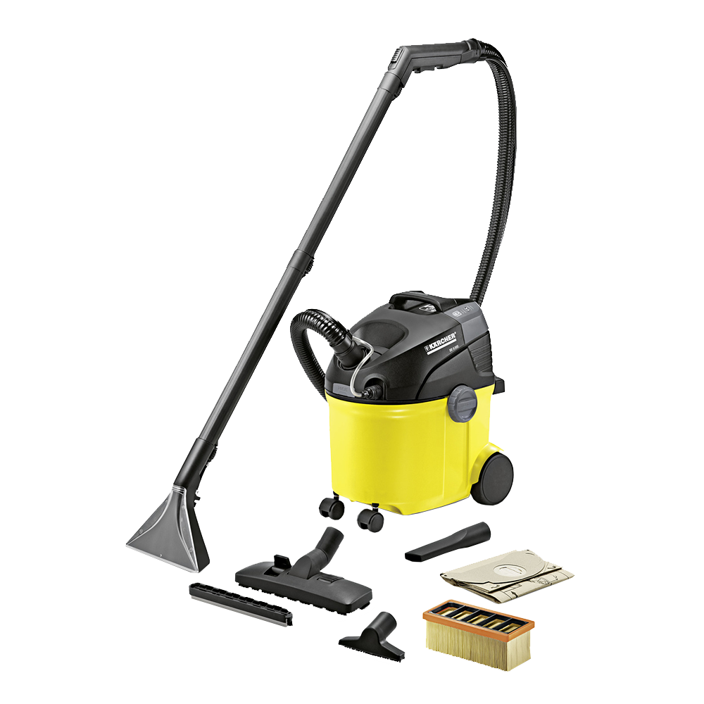 Пылесос моющий SE 5.100 - предназначен для очистки ковровых покрытий, мягкой мебели, матрасов, текстильной обивки стен и автомобильных сидений на всю глубину волокон. Пылесос подает воду и сразу же ее всасывает, собирая при этом как влажный мусор, так и сухой. Благодаря специальной конструкции и широкому ассортименту аксессуаров пылесос может использоваться как для сухой, так и для влажной уборки, гарантируя тщательную чистку и комфортную работу оператора. У аппарата большая вместимость бака - 4 л для чистой воды (которая подается через насадку) и 4 л для грязной воды (которую собрали вместе с грязью). Оснащен плоским складчатым фильтром. Расход воздуха - 70 л/с и разряжение - 210 мбар обеспечивают хорошую силу всасывания. В комплекте, кроме стандартных аксессуаров (удлинительные трубки, насадка для влажной уборки, насадка для сухой уборки, щелевая насадка, насадка для мебели) еще идет моющее средство.