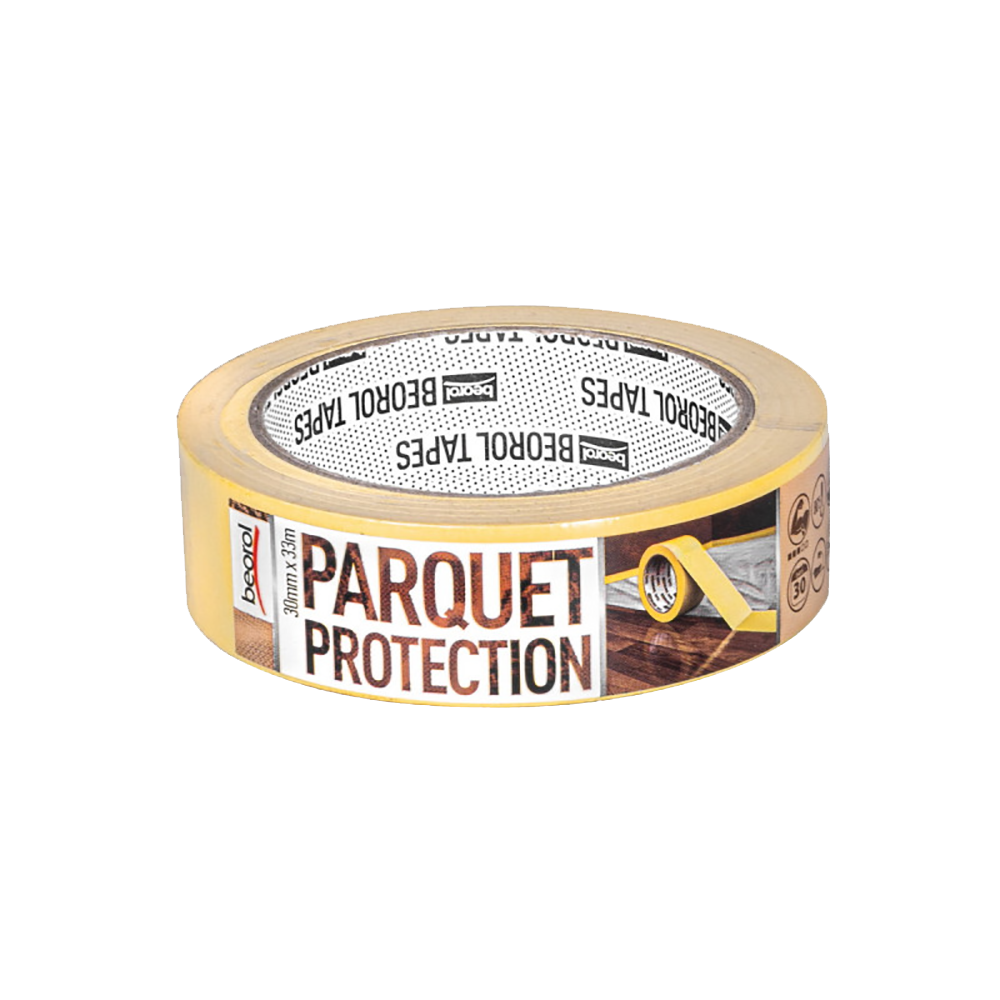 Лента малярная для паркета 30мм 33м - предназначена для защиты деликатных деревянных поверхностей, таких как паркет, ламинат, мебель, деревянные двери и окна, а также других поверхностей, требующих особого внимания. Благодаря деликатному клею обеспечивает адекватную защиту до 30 дней и после использования очень легко удаляется, не оставляя следов или остатков клея. Чрезвычайно износостойкая. Суммарная толщина: 125μm (бумага+клей). Термостойкость 80ᵒC. Цвет: желтый.