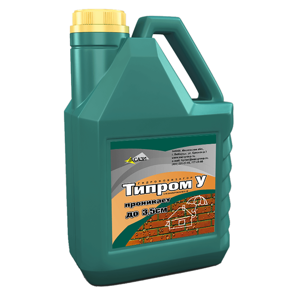 022 268 000Гидрофобизатор Типром Y 5л - готовый к применению состав, представляющий собой смесь силанов и силоксанов в органическом растворителе. Для поверхностной обработки строительных конструкций из керамического и силикатного кирпича, бетона, ячеистого бетона, штукатурки, тротуарной плитки, шифера, дерева, природного камня и других строительных материалов минерального происхождения с целью защиты от проникновения воды.