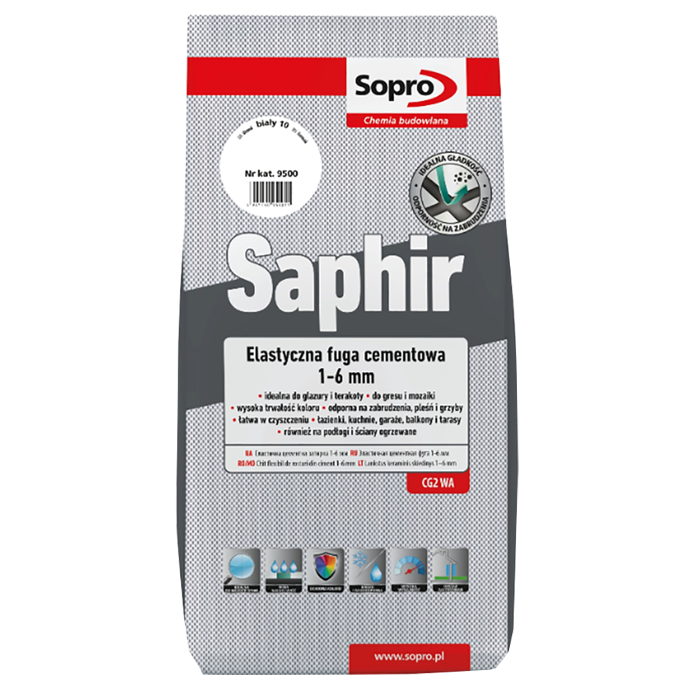 022 268 000Затирка Saphir N10 9500 Белый 3кг – это цементная, эластичная затирка для затирки швов керамической облицовки, с высокой стойкостью к проникновению воды и грязи, с эффектом «лотоса», то есть отталкиванием воды. Гладкая поверхность шва, а также высокая цветостойкость влияют на его эстетический внешний вид. Для затирки впитывающих и невпитывающих облицовок, с шириной шва 1-6 мм в помещениях и на открытом воздухе, на стенах и полах. Подходит также для полов и стен с подогревом и особенно для использования во влажных и мокрых помещениях.