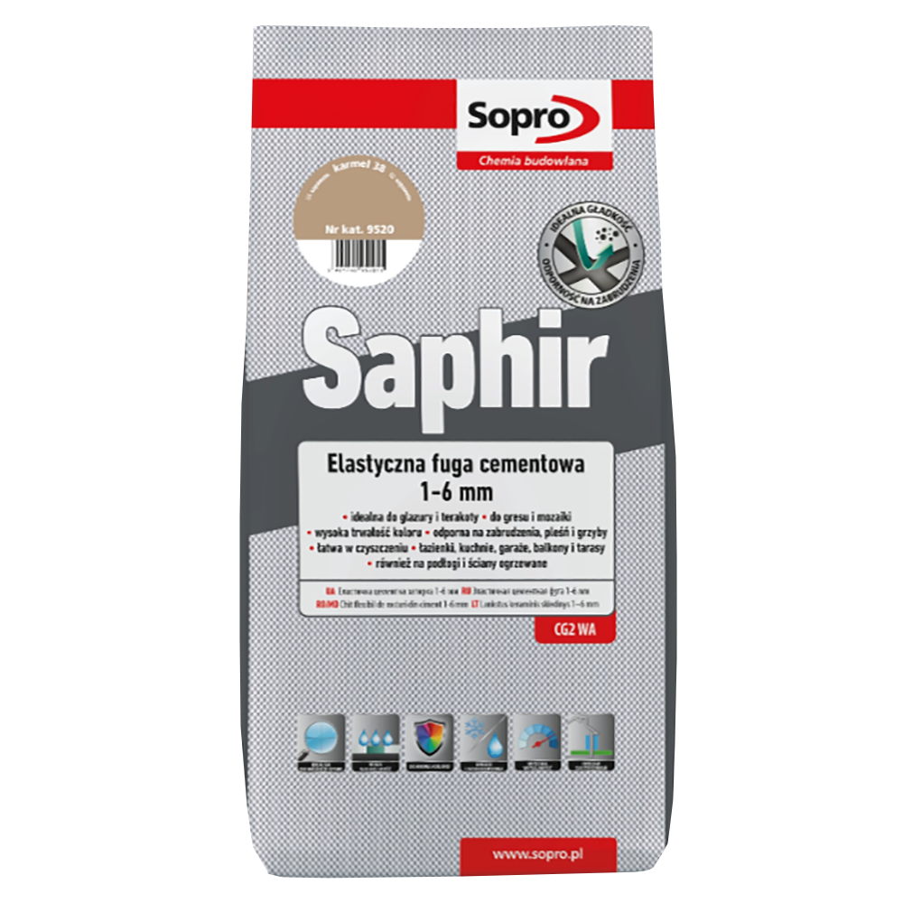 022 268 000Затирка Saphir N38 9520 Карамель 3кг – это цементная, эластичная затирка для затирки швов керамической облицовки, с высокой стойкостью к проникновению воды и грязи, с эффектом «лотоса», то есть отталкиванием воды. Гладкая поверхность шва, а также высокая цветостойкость влияют на его эстетический внешний вид. Для затирки впитывающих и невпитывающих облицовок, с шириной шва 1-6 мм в помещениях и на открытом воздухе, на стенах и полах. Подходит также для полов и стен с подогревом и особенно для использования во влажных и мокрых помещениях.