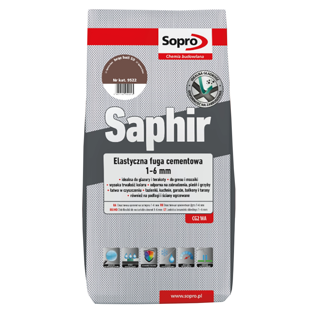 022 268 000Затирка Saphir N59 9522 Коричневый бали 3кг – это цементная, эластичная затирка для затирки швов керамической облицовки, с высокой стойкостью к проникновению воды и грязи, с эффектом «лотоса», то есть отталкиванием воды. Гладкая поверхность шва, а также высокая цветостойкость влияют на его эстетический внешний вид. Для затирки впитывающих и невпитывающих облицовок, с шириной шва 1-6 мм в помещениях и на открытом воздухе, на стенах и полах. Подходит также для полов и стен с подогревом и особенно для использования во влажных и мокрых помещениях.