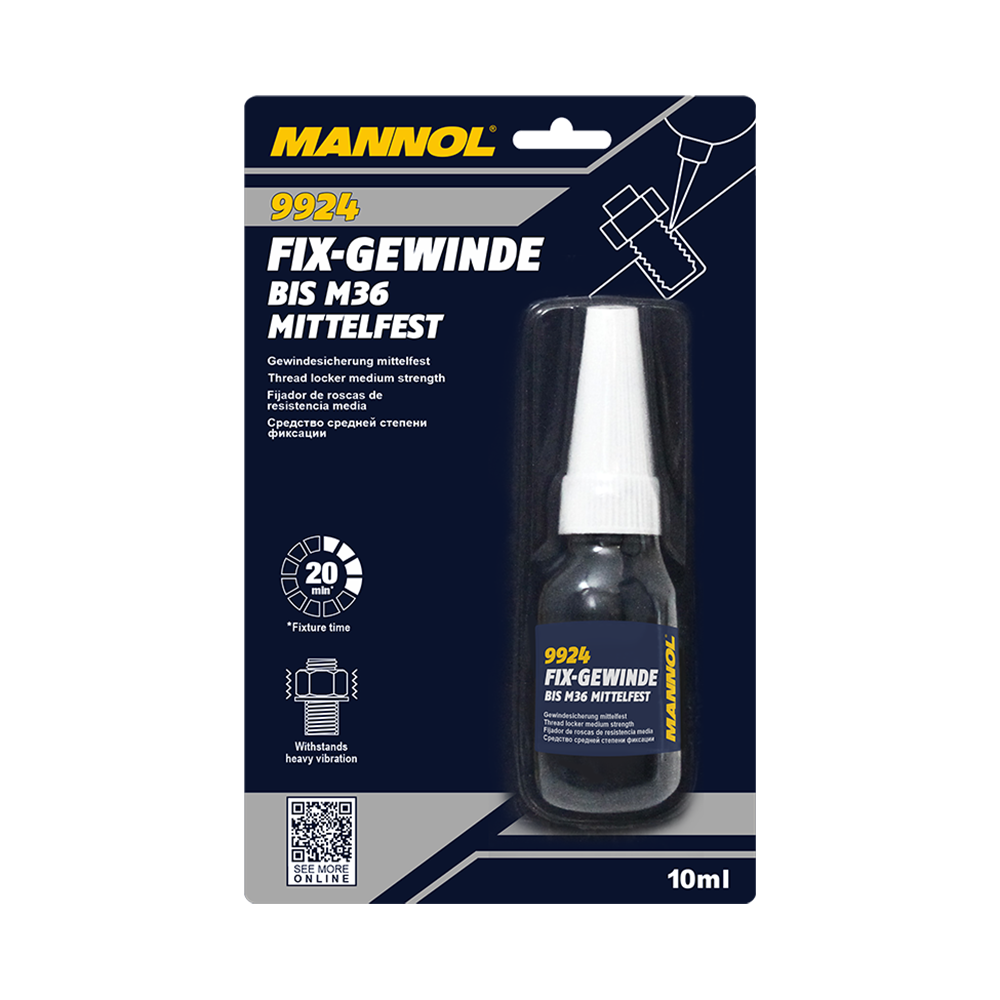 022 268 000Фиксатор для резьбы Mannol Fix-Gewinde 10мл - средство для фиксации всех типов резьб (средней фиксации): болтов, гаек, шпилек, шурупов и т.д. Предотвращает самоотвинчивание крепежа из-за повышенных нагрузок и вибрации. Подходит для любых резьбовых соединений во всех узлах автомобилей, мототехники, коммерческой техники, а также в промышленности и в быту. Может использоваться для герметизации резьбы и узких зазоров, а также как антикоррозионное средство.