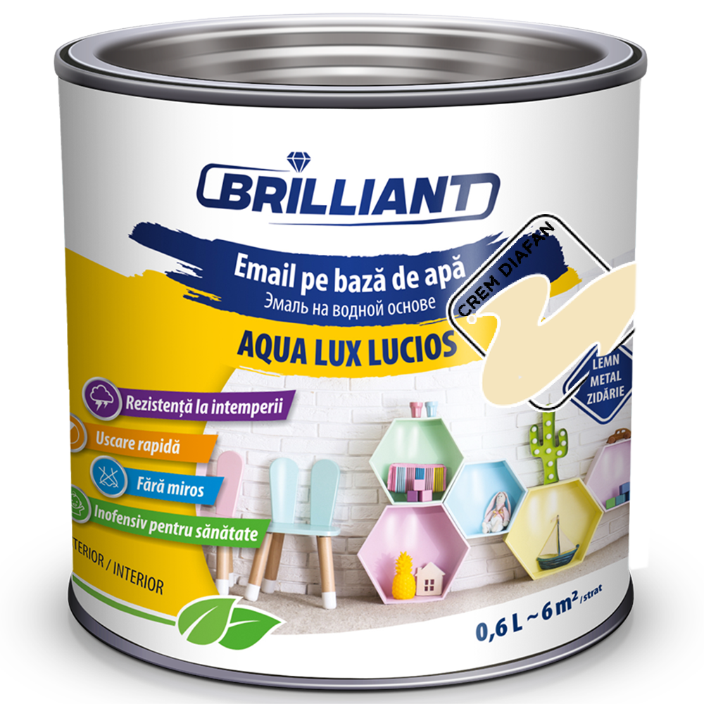 022 268 000Эмаль акриловая глянцевая Aqua Lux Lucios крем диафан 0.6л - представляет собой акриловую атмосферостойкую эмаль, которую можно использовать для за- щиты наружных и внутренних поверхностей из: дерева (окна, двери, деревянные жалюзи, садовая мебель, другие дере- вянные элементы), металла (трубы, радиаторы) и каменной кладки. Применяется для покрытия новых поверхностей, а также для ремонта ранее окрашенных поверхностей, а цветные тона можно использовать и для покрытия отопительных приборов (радиаторов). Эмаль имеет элегантный глянцевый вид.