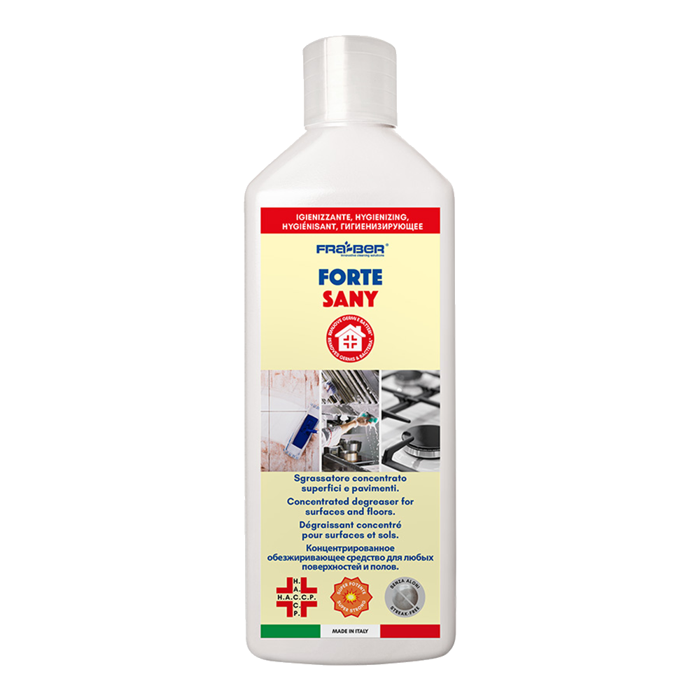022 268 000Средство обезжириватель концентрат Fra-Ber Forte Sany 1л - Удаляет жирные и масляные загрязнения, а также белки растительного происхождения и обладает моющем действием. Используется на кухне, в туалетных комнатах, на плитке, вытяжке, гриле и механических компонентов. Распылить средство, а затем смыть влажной тканью. Оставить действовать на 5-15 минут для достижения более сильного дезинфицирующего эффекта. Всегда тщательно и аккуратно смывать. Предварительно протестировать действие перед использованием на небольшом участке поверхности, если она деликатная или новая