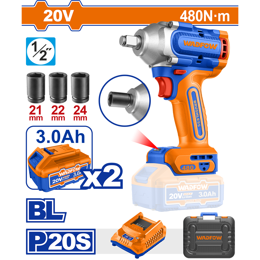 Гайковерт ударный с аккумулятором 20.0В 3.0Aч 600Нм Wadfow WCD1B48