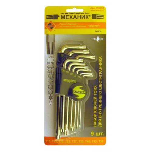 Ключи Torx 20876 - 9штук (T10, 15, 20, 25 ,27, 30, 40, 45, 50 мм) блистер арт.20876 состоит из 9 инструментов, которые используются для монтажа и демонтажа резьбовых соединений с профилем Torx. Ключи изготовлены из прочной инструментальной стали с добавлением хрома и ванадия.