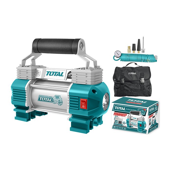 022 268 000Компрессор авто с фонариком TTAC2506 - это инструмент, незаменимый прежде всего для автомобилистов, хотя при его помощи можно накачивать не только автомобильные колеса, но также, к примеру, надувные лодки. Данный прибор питается от электросети 12 В с номинальным потреблением силы тока 18 А. При этом компрессор создаёт максимальное рабочее давление 9 Бар, обеспечивая 15 минут непрерывной работы. Подача воздуха осуществляется через пятиметровый насосный шланг с латунным быстросъемным адаптером, а электропитание обеспечивает трёхметровый кабель с разъемом для прикуривателя. Данный компрессор оснащён системой LED-индикации, а также высокоточным и надёжным манометром. В комплект поставки входит комплект клемм для подключения напрямую к автомобильному аккумулятору и холщовая сумка для хранения и транспортировки компрессора.