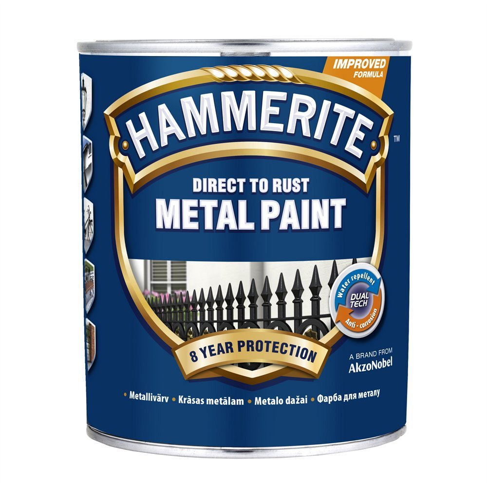 Hammerite — уникальная формула краски 3в1 не требует применения преобразователя ржавчины и грунта. Специальная технология Hammerite, основанная на склеивании в процессе сушки металлических хлопьев и частиц закаленного стекла, обеспечивает непреодолимый барьер для влаги и долговременную защиту. Краска наносится на ржавые, окрашенные или чистые поверхности из стали, чугуна, нержавеющей стали, цветных металлов, гальванизированные, а также деревынные и некоторые пластиковые, устойчивые к растворителям. При окрашивании гальванизированных поверхностей, цветных металлов, нержавеющей стали, а также сварных швов черных металлов необходимо применять специальный грунт Special Metals Primer. При окрашивании деревянных поверхностей используйте предварительно любой водоразбавляемый акриловый грунт.