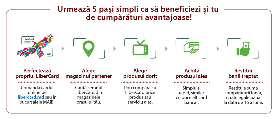 Nu-ți mai amâna planurile! Bucură-te de produsele/serviciile noastre atunci când ai nevoie de ele. Magazinul nostru a devenit partener al primului card de cumpărături în rate și fără dobândă LiberCard din Moldova.