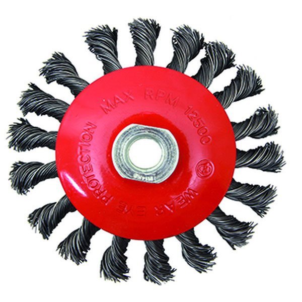 Проволока сплетена в пучки, что позволяет затрачивать меньше времени для получения качественного результата. На посадочном отверстии щетка имеет резьбу М14 для угловой шлифовальной машины.