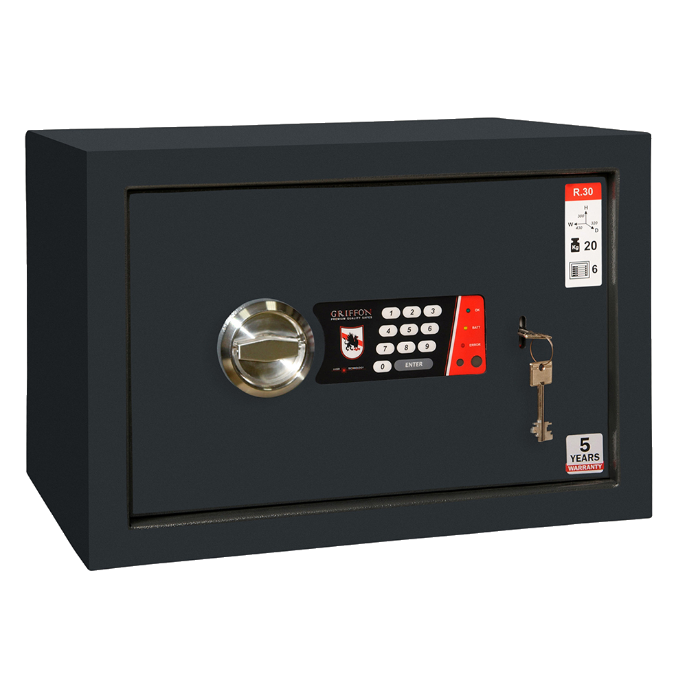 Сейф R.30.K.E 300х430х320мм — оптимальный и надежный вариант изделий для хранения ценностей и документации в любом доме или учреждении. Преимущества данной серии: толщина двери 5 мм, толщина корпуса 2 мм, оборудованы стальными ригелями, кассой, съемной полкой.