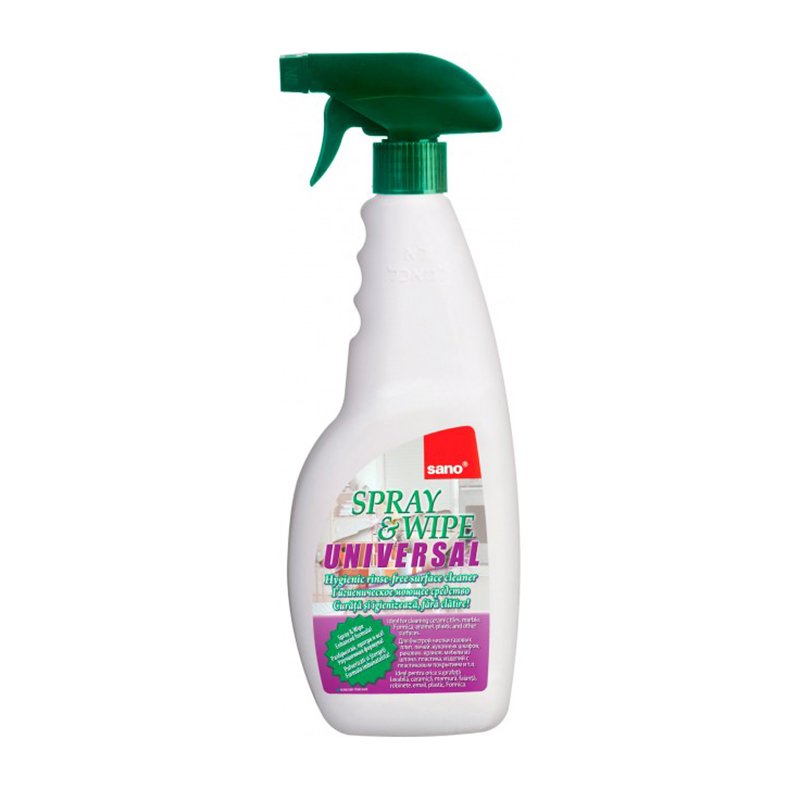 022 268 000Чистящее средство универсальное Sano Spray&Wipe 750мл - универсальное концентрированное гигиеническое средство для быстрой очистки любых поверхностей без мытья. Удаляет грязь и следы жира. обладает антибактериальным эффектом. Подходит для чистки плит, кухонных шкафов, раковин и кранов, столов, дверей, стен и мебели с покрытием из пластика и шпонов, пластмассовых жалюзи и др.